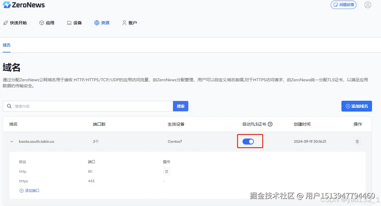 在 ZeroNews 管理平台的 "资源" 管理界面下,添加域名,如添加 baota 域名