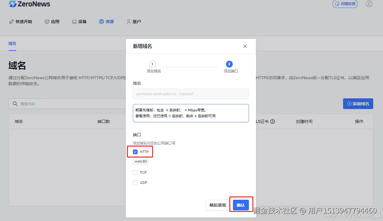 在端口设置界面,勾选 HTTP ,然后点击 "确认",完成域名添加