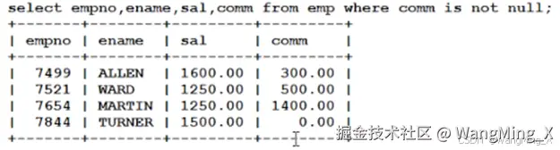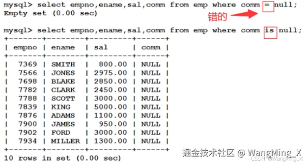 - 注意: 在数据库当中null不能使用等号进行衡量。需要使用is null因为数据库中的null代表什么也没有,它不是一个值,所以不能使用等号衡量。