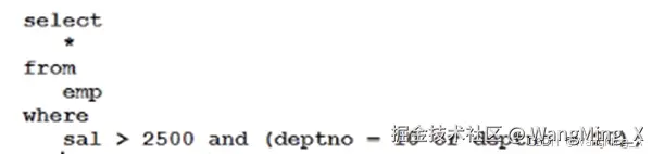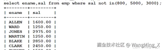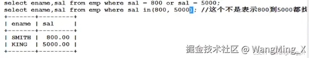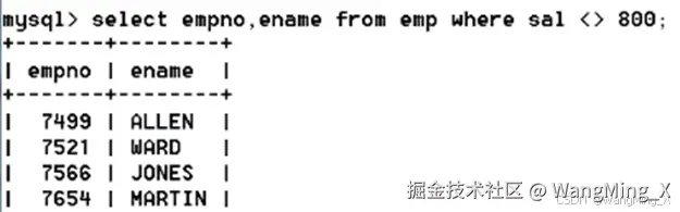 - select empno,ename from emp where sal <> 800;//小于号和大于号组成的不等号