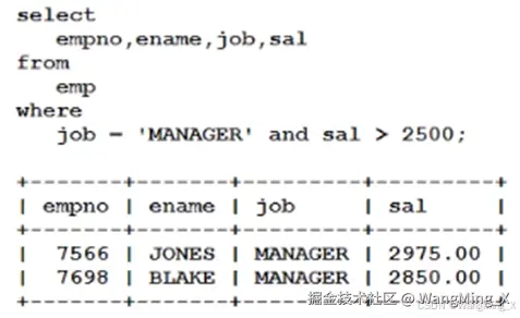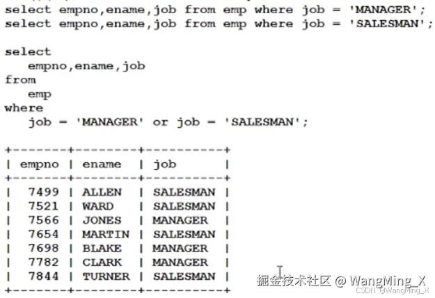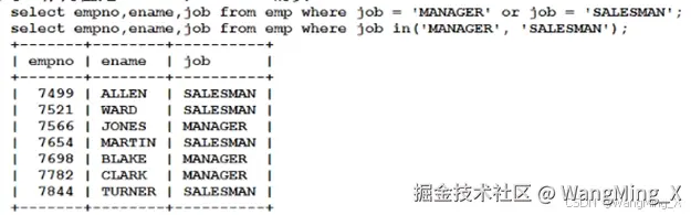 - 查询工作岗位是MANAGER和SALESMAN的员工?