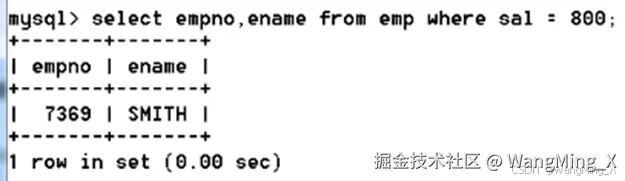 - select empno,ename from emp where sal = 800;