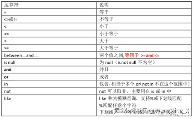 - 条件查询需要用到where语句,where必须放到from语句表的后面支持如下运算符