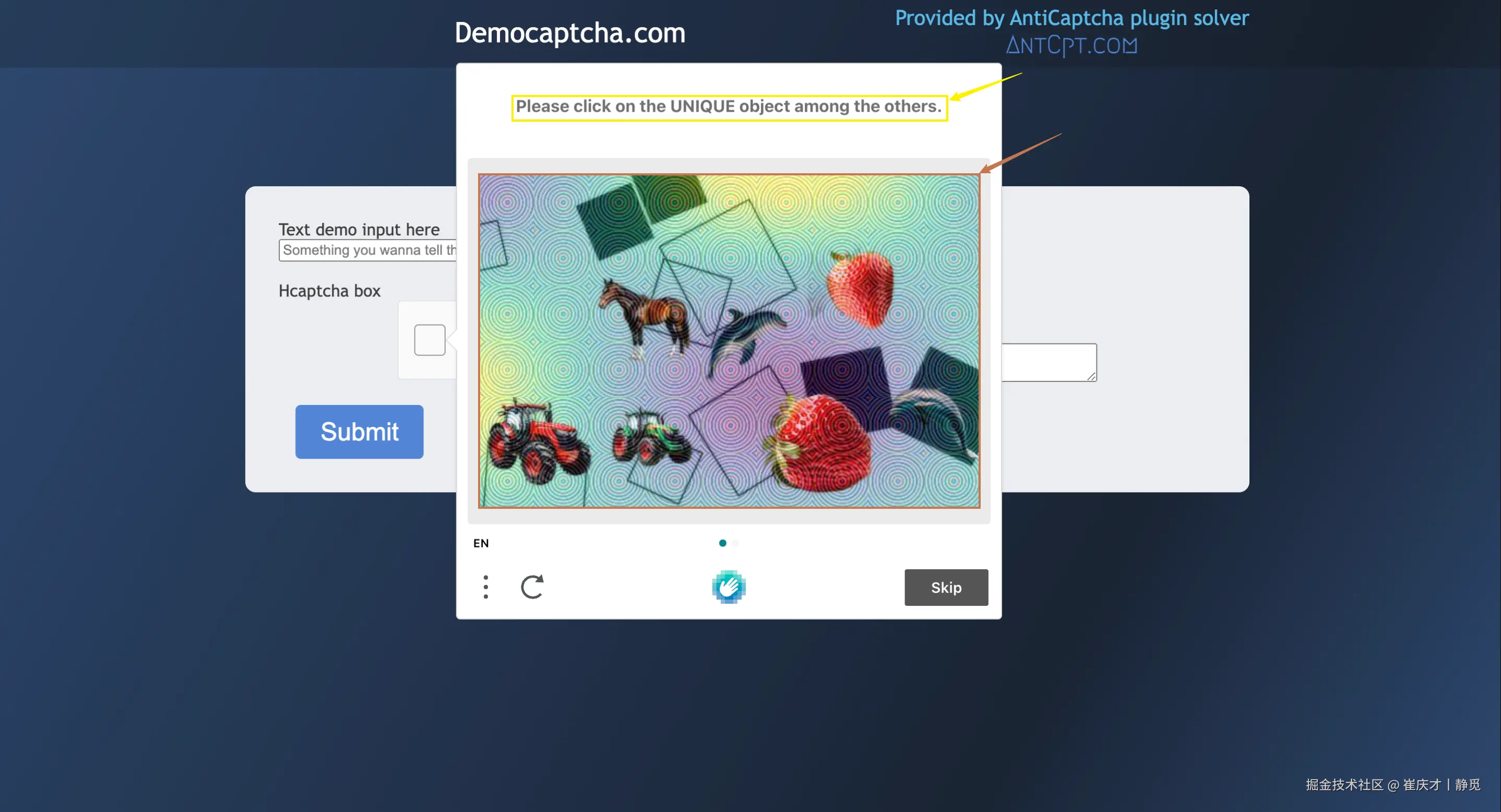 首先先了解下基本的使用方式,就是输入需要处理 hCaptcha验证码图像,便可获得处理后的结果,首先需要简单地传递一个 queries 字段,这个就是具体hCaptcha验证码图像,我们需要去一个有hCaptcha验证码网站中截取这个验证码图片,示例网站链接为: https://democaptcha.com/demo-form-eng/hcaptcha.html,点击复选框即可显示具体的完整验证码图片,如下图所示: