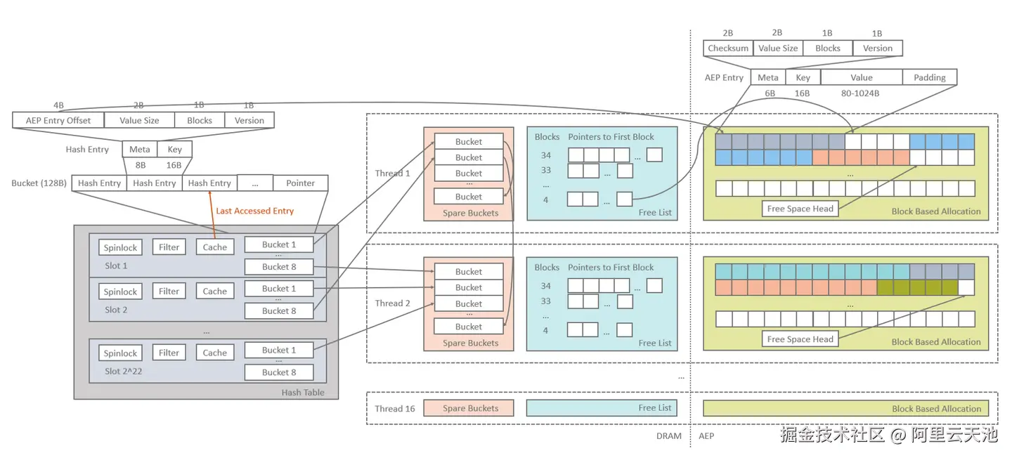 所有在运行时分配的DRAM和AEP空间均按写入线程分组,每个写线程独占一组空间,确保没有资源竞争。