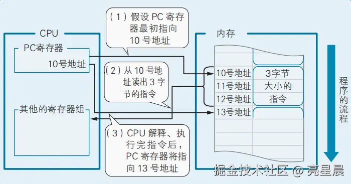 假设 PC 寄存器正指向内存中一个从 10 号地址开始的 3 字节指令。CPU 解释执行完这条指令后,PC 寄存器中的值就变成 10+3 = 13 了。也就是说,程序基本上是从内存中的低地址(编号较小的地址)开始,向着高地址(编号较大的地址)流下去的 。我们把程序的这种流动称为“顺序执行”。