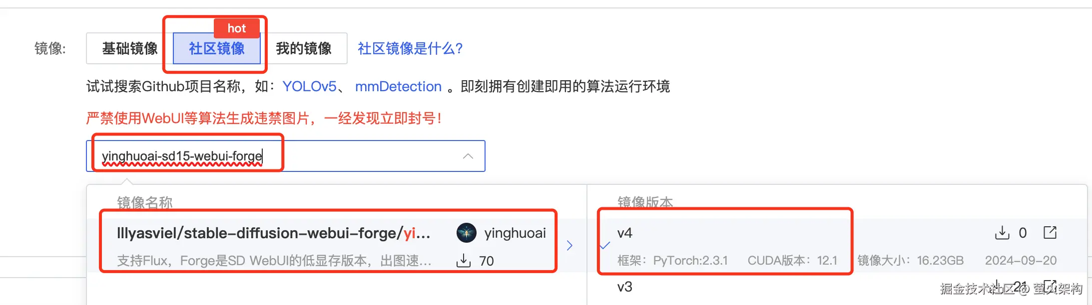 镜像选择“社区镜像”->“yinghuoai-sd15-webui-forge”。