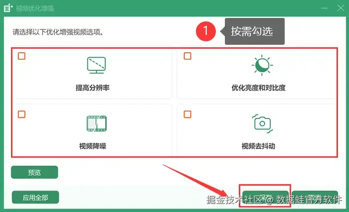 第二步: 在 【输出格式】 选项中,选择mp4作为目标格式。如果需要,可以利用内置的 【优化增强视频】 功能,提升原始的mkv视频的分辨率、优化亮度和对比度、降噪以及去抖动。