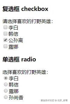 <h3>单选框 radio</h3> 选择喜欢的打野英雄:<br>