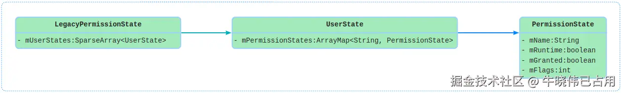 用一句话总结上面类图,通过PackageSetting可以拿到LegacyPermissionState对象,而通过userid可以拿到每个用户的所有权限对应UserState对象,而该对象存储了所有的权限,每个权限的key值是权限名,value值是具体的权限状态信息是PermissionState对象。