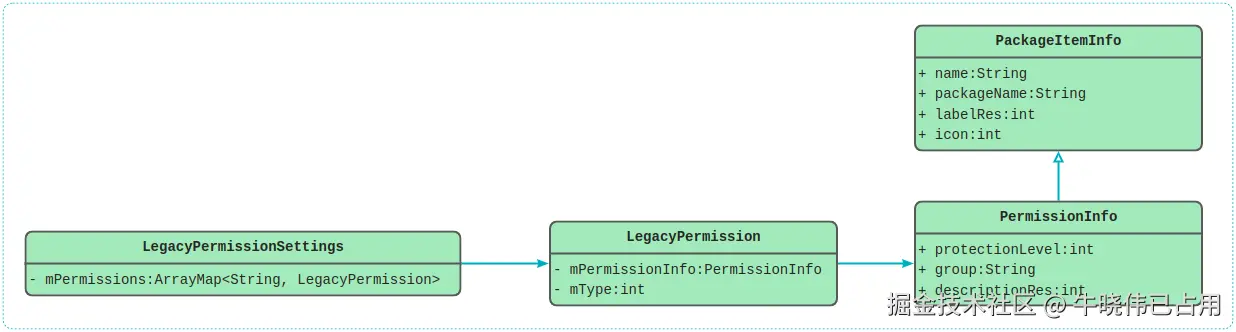 而我把记录所有声明权限的工作交给了LegacyPermissionSettings类,如下是它的类图