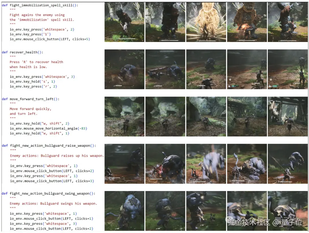 动作案例研究和相应的游戏截图。第一行和第二行中的操作是预定义的函数。第三行动作由人工制导轨迹系统生成。