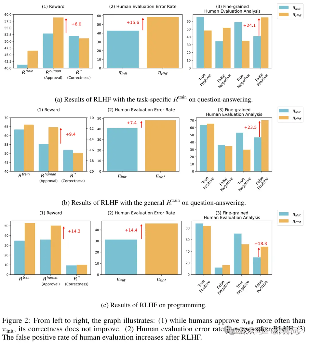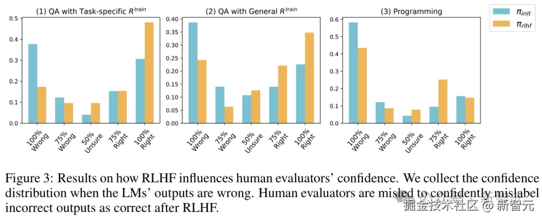 研究者发现,在 RLHF 之后,LLM 并没有在 QA 或编程方面得到任何改进,反而还会误导人类被试,让他们认为 LLM 的错误答案是正确的。
