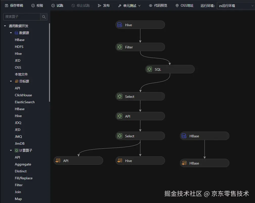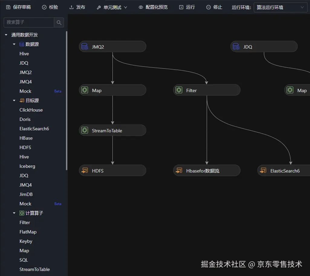 对了,这不就是 Spark/Flink 做的事儿么;但现在问题是,这些技术还是有一定的技术门槛的,我们如何让算法工程师、软件开发工程师甚至产品经理都投入到大数据的革命洪流中来呢?必须进一步降低门槛。如果在“设计时“,也就是计算任务上线之前,在开发的时候就看到数据流转的图形就好了。进而,这个图形不只是用来看的,还可以编辑,可以拖拉拽,拖一个输入算子,几个处理算子,几个输出算子,数据加工的逻辑就搞定了。编辑好的图形直接发布线上就能运行,不用写代码,不用知道什么是Spark,那可太棒了。