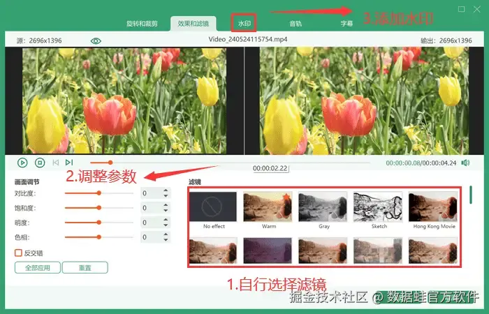 第二步: 按需选择编辑或剪辑功能,给视频增加滤镜或者水印等效果,为自己的视频增添光彩。