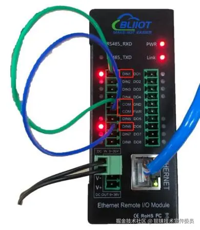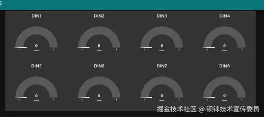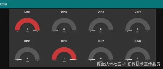 为了便于测试,将 M160T 的 DIN1 和 DIN6 引脚短接到 COM,DIN1 和 DIN6 输入高电平,状态位变为 1。 执行完后将看到网页显示 M160T 设备当前DIN1和 DIN6 仪表盘高亮,状态位为 1。