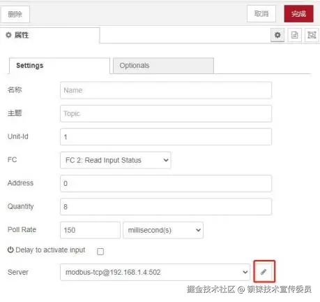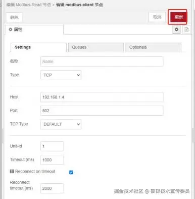 使用的依赖模块有:“ node-red-dashboard ”、“ node-red-contrib-modbus ”。请参考上方“安装依赖模块 ”