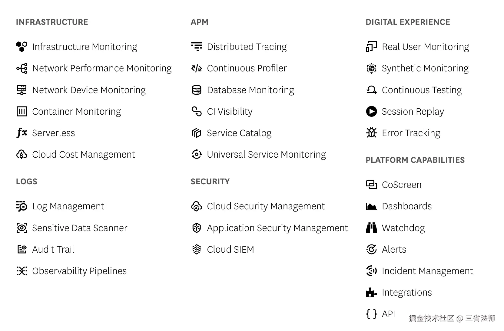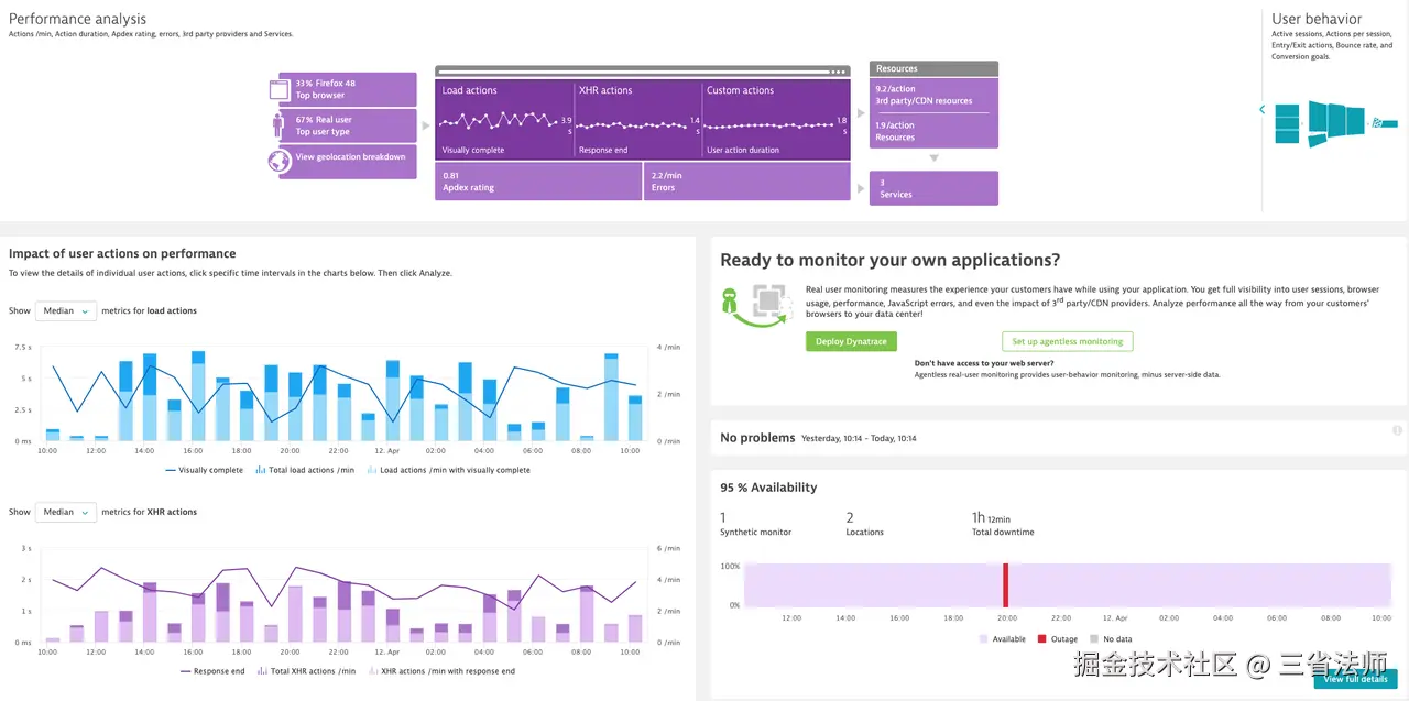 Dynatrace 是 APM 领域的头部厂商,提供了一整套的涉及应用监控、运维、云服务的应用SaaS服务。其中涉及到前端监控有三个模块:
