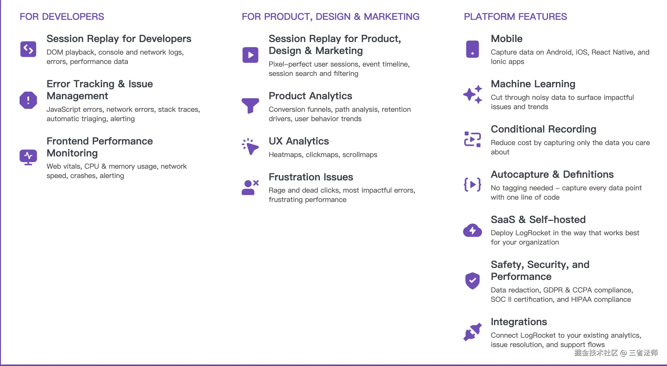 LogRocket 是 session replay 领域的领跑者,其功能涉及录制回放、数据分析、性能数据分析、可视化交互。