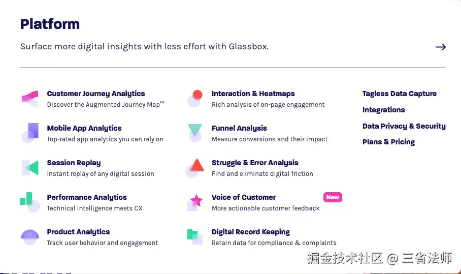 高居榜首的 Glassbox 主要功能有用户旅程、会话回放、性能分析、产品分析、交互热点、漏斗分析、错误分析等核心功能,可以作为平台的精品参考。