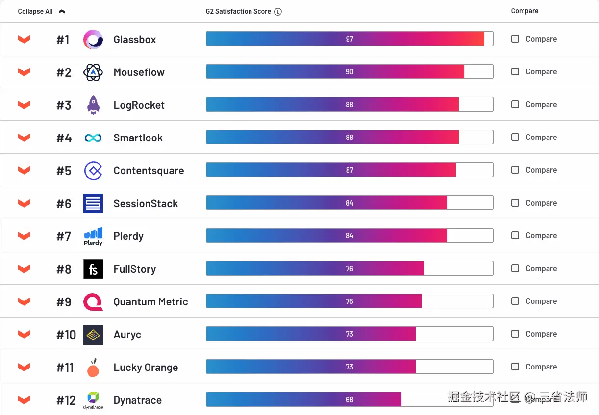 本文选取了排名比较靠前的 LogRocket、FullStory、Dynatrace、DataLog进行精品调研。