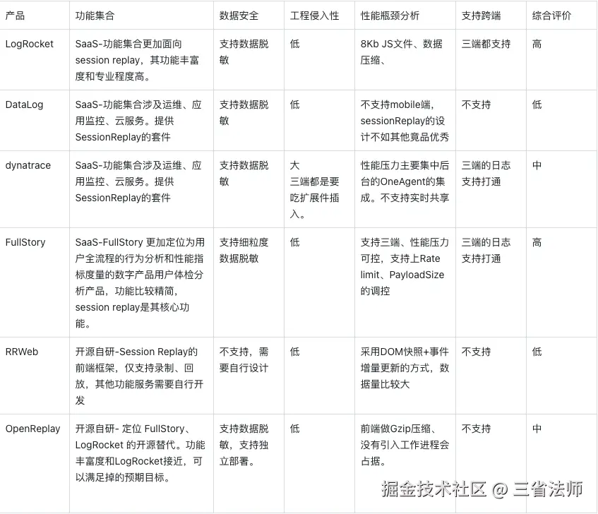 我们重点关注 Session Replay 领域的解决方案。