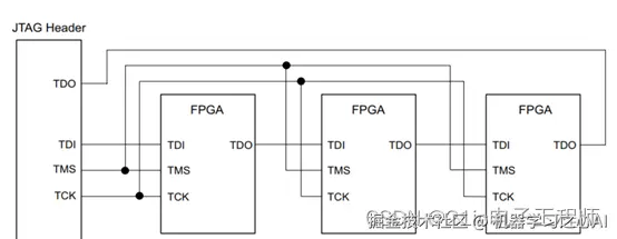 在使用JTAG菊花链时,需要将多个FPGA芯片串联在一起,形成一个链式结构。在菊花链中,第一个FPGA芯片连接到主机(例如PC或嵌入式系统),并且通过JTAG接口向后传递数据和控制信号。其他芯片连接到前面一个芯片的JTAG接口,并且依次串联在一起。