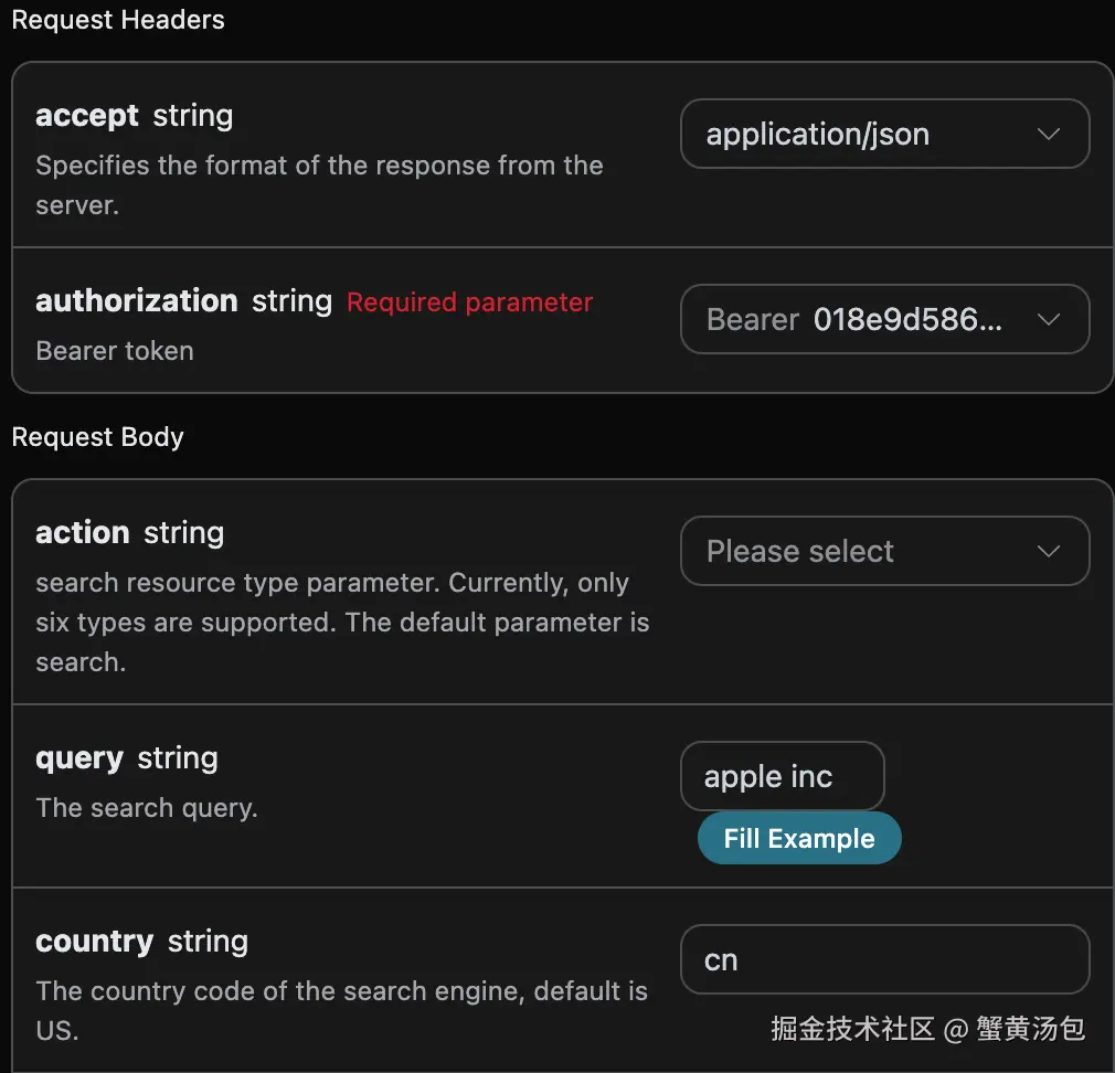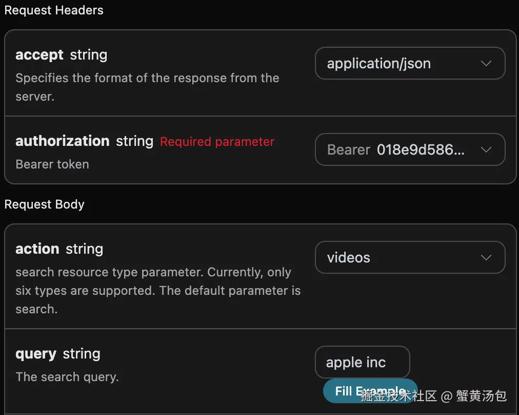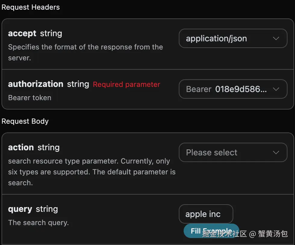 accept:想要接收怎样格式的响应结果,这里填写为application/json,即 JSON 格式。authorization:调用 API 的密钥,申请之后可以直接下拉选择。