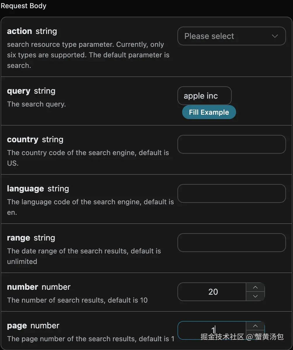action:搜索资源的类型,目前只支持六种类型,默认是search。query:搜索的关键词。country:自定义搜索结果的所在国家,默认是美国(US)。language:自定义搜索结果的语言,默认是英语(en)。range:自定义搜索结果的时间范围,默认是没有限制的。number:自定义搜索结果的分页页面大小,默认是10。page:自定义搜索结果的分页页数,默认是1。