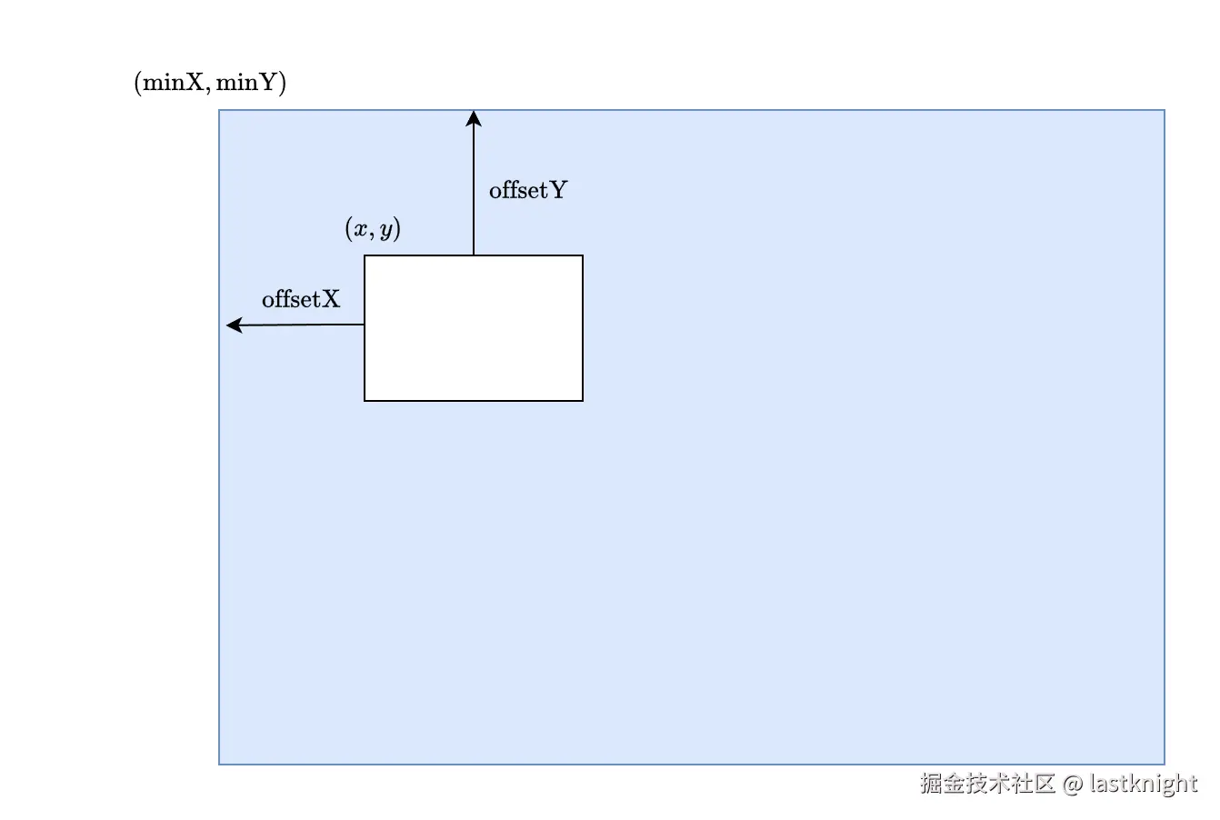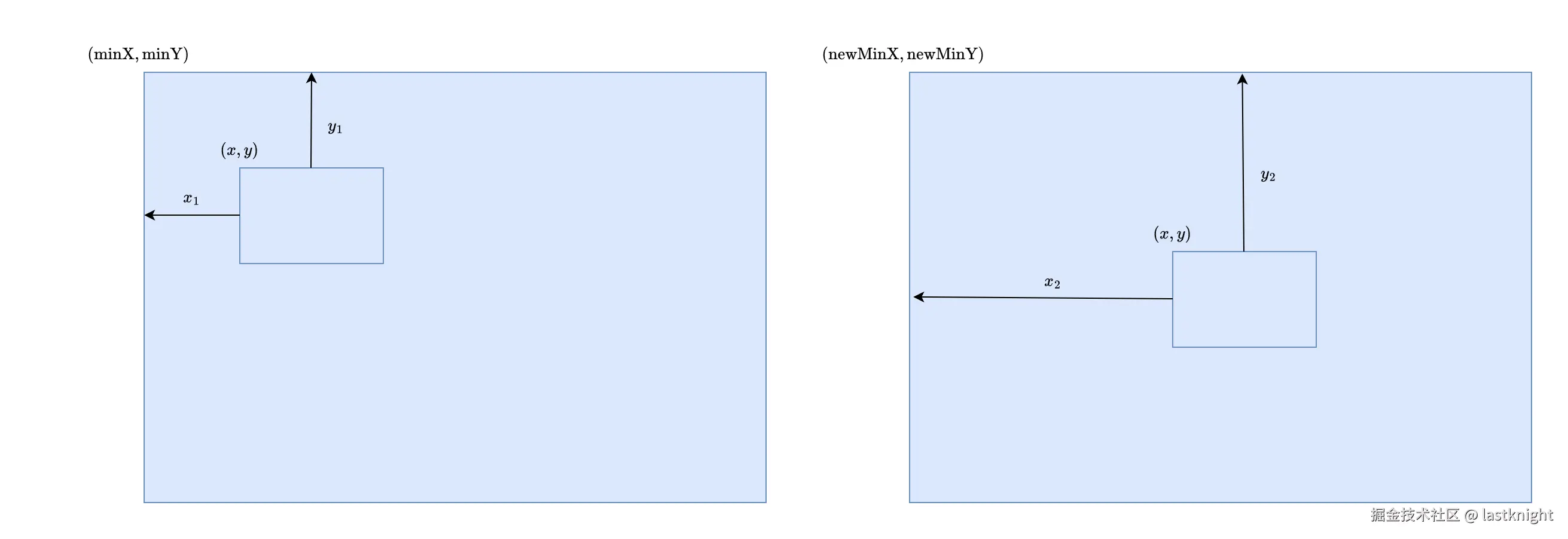 假设以点 进行缩放,在缩放完成后,点 相对于画布应保持不变,即该点始终距离画布左侧为 像素,距离画布顶部 像素,在缩放前后都是一样的。