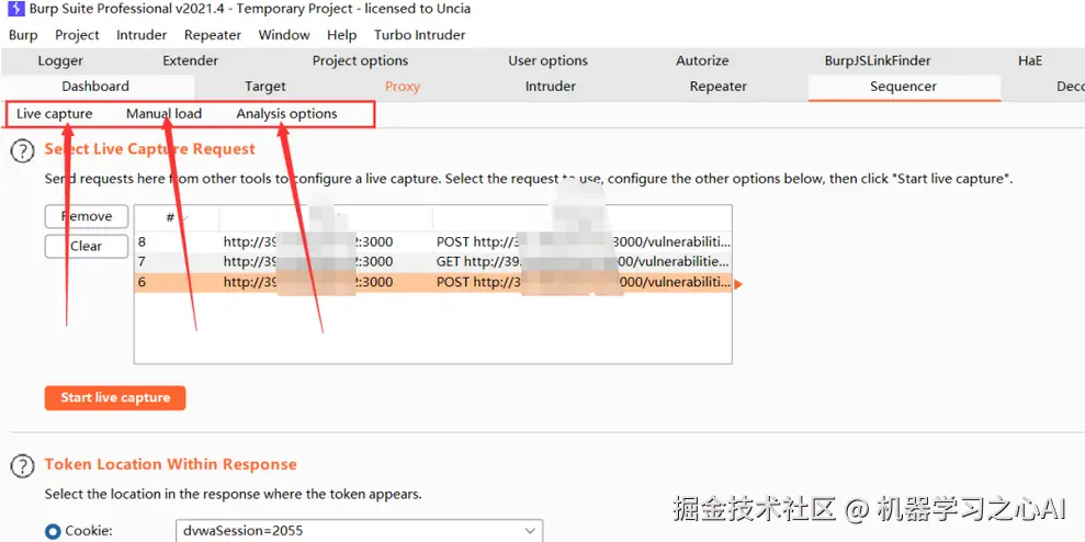 Sequencer模块是一个用于对随机数生成器和其他类型的输入数据进行统计分析的工具。通过对输入数据进行分析,可以确定输入数据的质量并评估其安全性。可以帮助测试人员确定应用程序在使用随机数生成器时是否足够随机,以及在处理密码和其他敏感信息时是否存在可预测的模式。使用Sequencer模块,您可以捕获一组输入数据,并对它们进行分析,以确定它们之间是否存在任何相关性或模式。在进行分析之前,您可以选择从输入数据中删除任何重复项或不可见字符。简单的来说就是:通过不停的发送数据包,用来预测应用程序的session tokens或其他重要数据项是否可以预测。