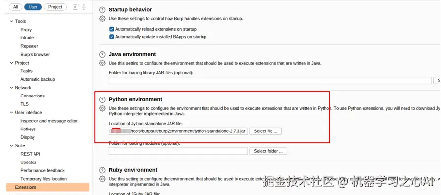 然后将下载好的jpython.jar文件导入到burpsuit,即可下载burpsuit支持的python扩展插件。
