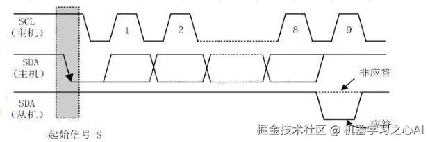 - 应答信号为高电平时,规定为非应答位(NACK),一般表示接收器接收该字节没有成功。