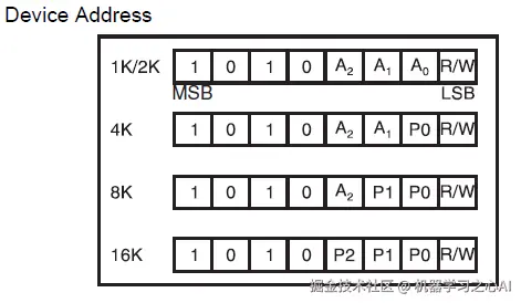 **对于并联在一条IIC总线上的每个IC都有唯一的地址。**那么看一下从器件地址,可以看出对于不同大小的24Cxx,具有不同的从器件地址。由于24C02为2k容量,也就是说只需要参考图中第一行的内容: