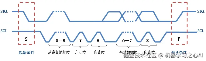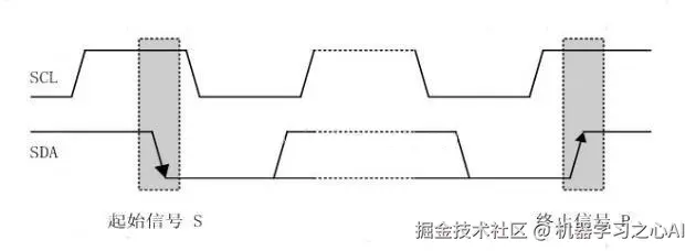 - **起始信号:当时钟线SCL为高期间,数据线SDA由高到低的跳变;**启动信号是一种电平跳变时序信号,而不是一个电平信号;