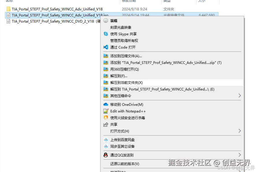 2、解压安装包,选择解压到“TIA_Portal_STEP7_Prof_Safety_WINCC_Adv_Unified_V18”