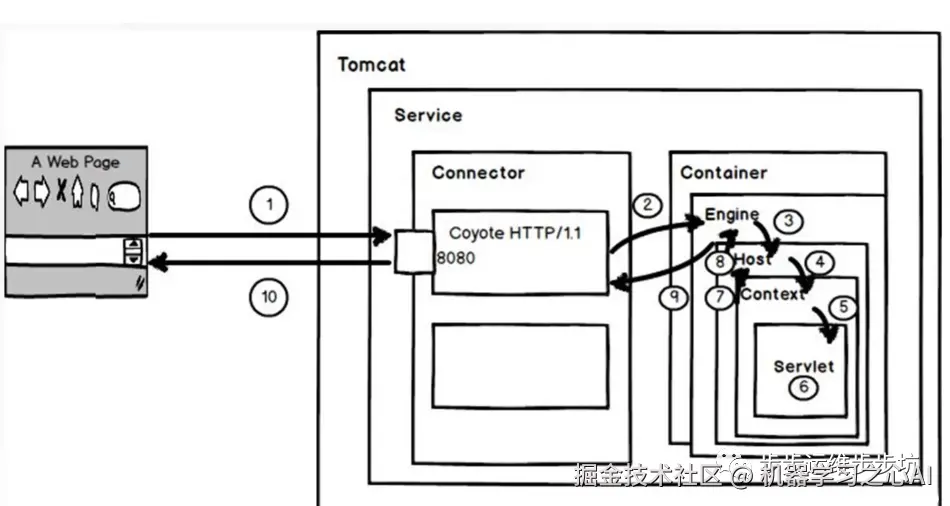 用户在浏览器中输入网址,请求被发送到本机端口8080, 被在那里监听的Connector 获得。Connector 把该请求交给它所在的Service 的Engine (Container) 来处理,并等待Engine 的回应。请求会在Engine、 Host、 Context 和wrapper 这四个容器之间层层调用,最后在Servlet 中执行对应的业务逻辑、数据存储等。执行完之后的请求响应在Context、 Host、 Engine 容器之间层层返回,最后返回给Connector,并通过Connector 返回给客户端。
