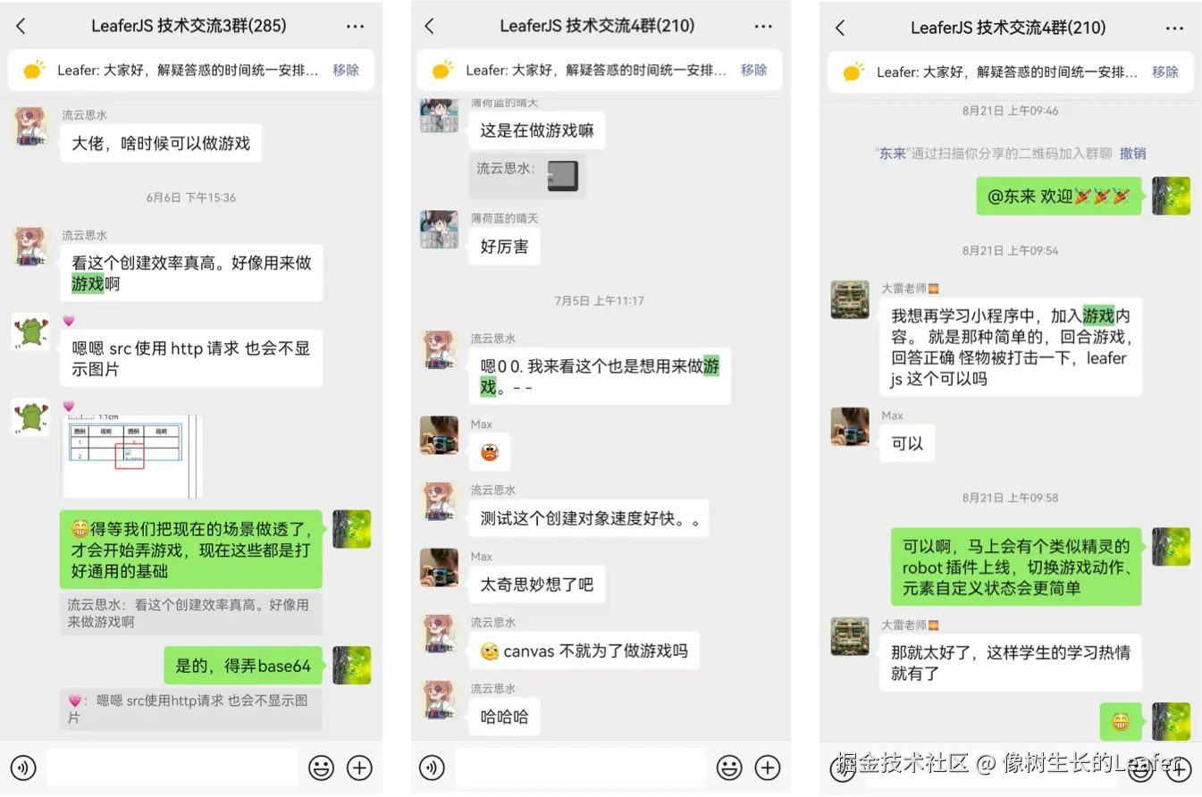 尽管我们没有为游戏开发做过专门支持,但用户的好奇心是挡不住的。陆续有人用 LeaferJS 开发了一些有趣的小游戏,并在社区分享。比如 @子洋 开发了一系列的小游戏,还专门写了小游戏教程 《Leafer 开发小游戏 - 拼图》,那个时候我还没有特别重视起来。