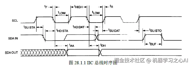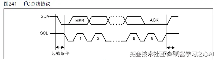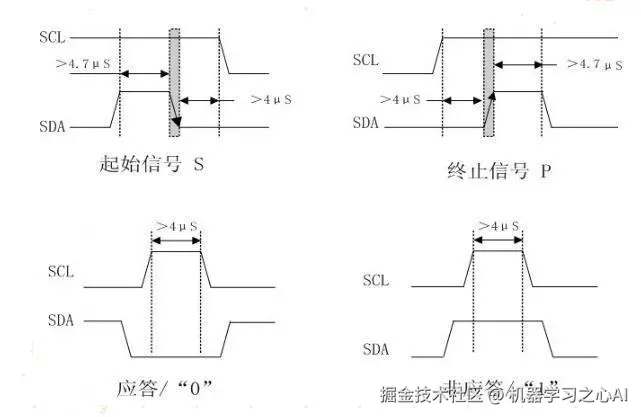 - **起始信号:当时钟线SCL为高期间,数据线SDA由高到低的跳变;**启动信号是一种电平跳变时序信号,而不是一个电平信号;