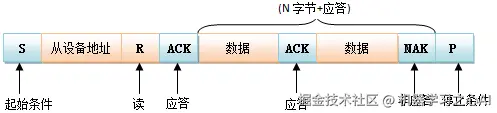 在从机产生响应时,主机从发送变成接收,从机从接收变成发送。之后,数据由从机发送,主机接收,每个应答由主机产生,时钟信号仍由主机产生。若主机要终止本次传输,则发送一个非应答信号,接着主机产生停止条件。
