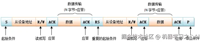 - 主设备往从设备中写数据,然后重启起始条件,紧接着从从设备中读取数据;或者是主设备从从设备中读数据,然后重启起始条件,紧接着主设备往从设备中写数据。数据传输格式如下:
