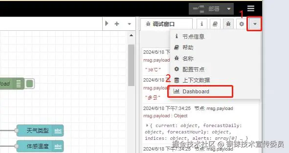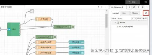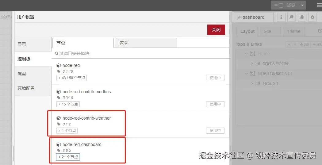 使用的依赖模块有:“ node-red-dashboard ”、“ noed-red-contrib-weather ”。请参考上方“安装依赖模块 ”步骤安装上相应依赖模块。