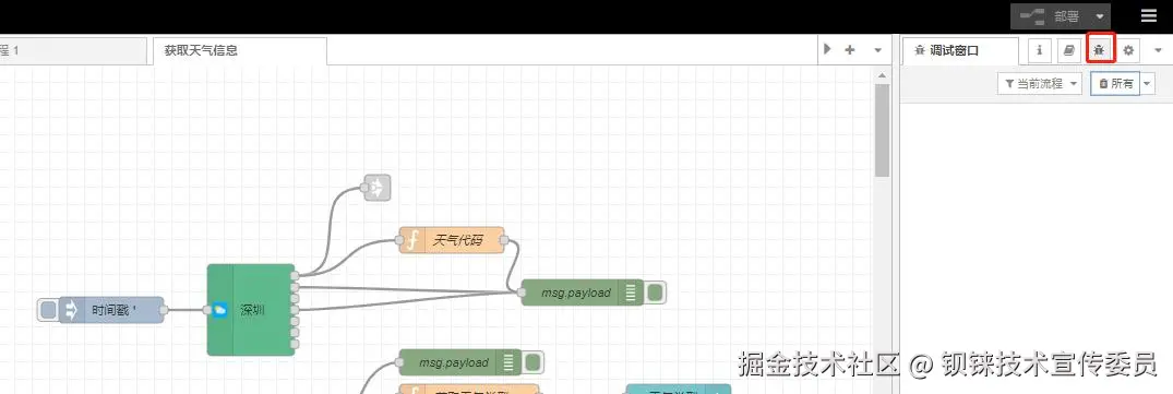 案例功能:使用node-red 工具与气象网站通信。基于node-red 部署程序,实现获取深圳天气信息。