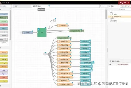 为便于测试,我司提供的经验证的Node-Red获取天气信息程序为案例 “ node-red\node_weather ”目录下的 weather.json 文件。请参考上方“导入节点文件 ”步骤导入对应节点文件。