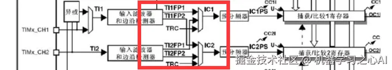 STM32为了更好的优化使用,TIMx_CH1通道1捕捉到的信号可以传输到IC1,TIMx_CH1捕捉到的信号也可以连接到IC2,TIMx_CH2捕捉到的信号也可以连接到IC2,也可以连接到IC2