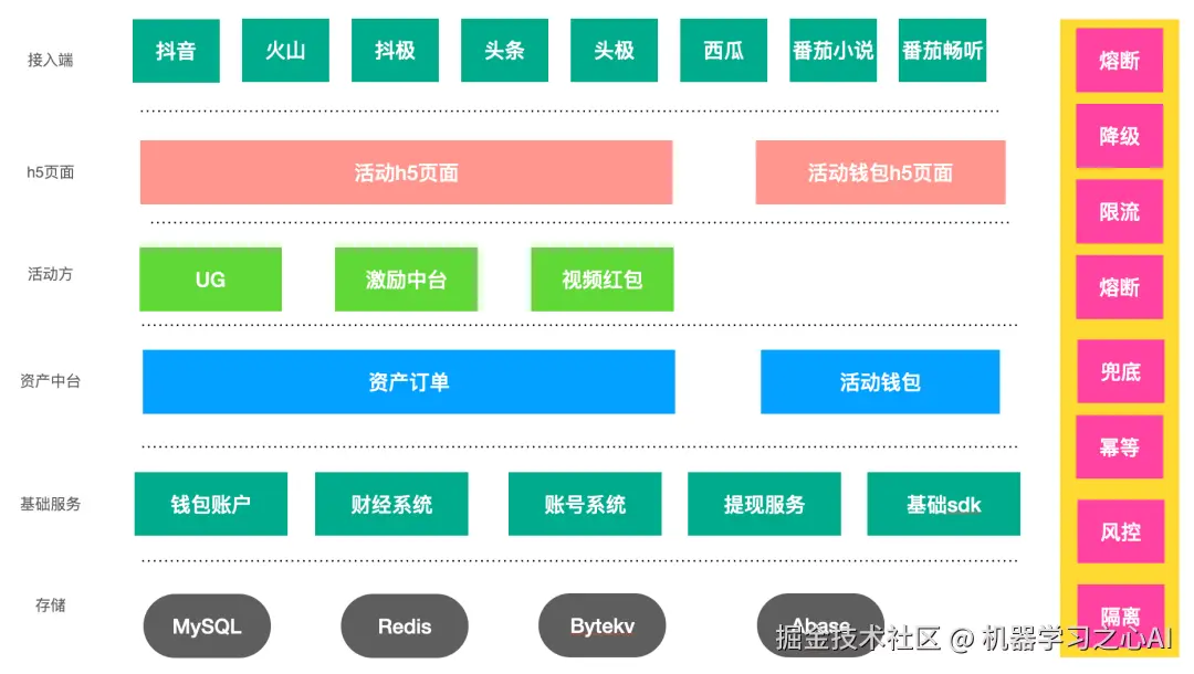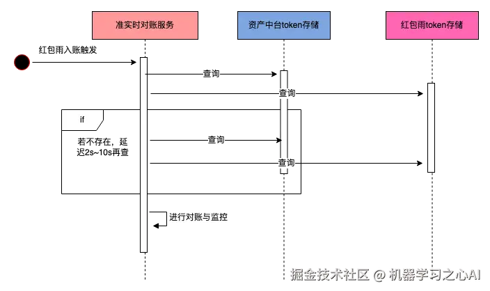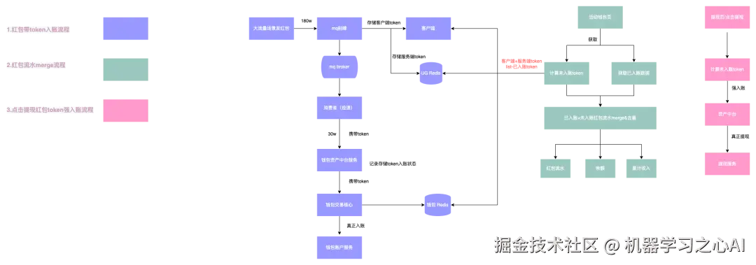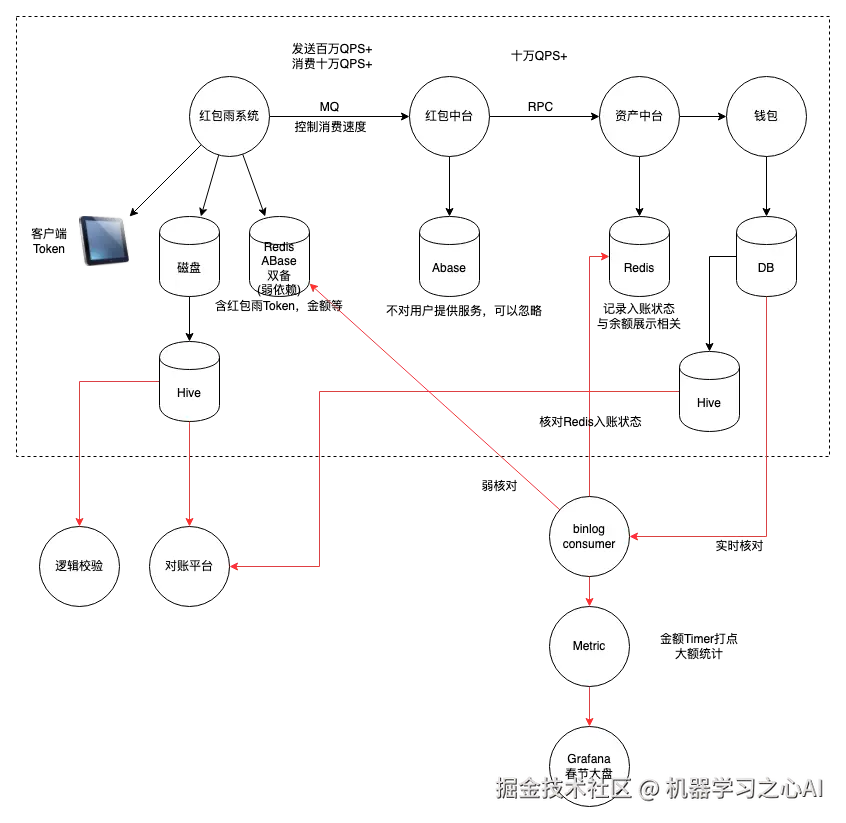 - 准实时对账:红包雨已入账的红包数据反查钱包资产中台和活动侧做准实时对账