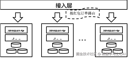 按红包订单划分逻辑单元,单元内业务闭环。服务rpc调用时,使用红包订单号的hash值为key寻找下一跳地址。对同一个红包的所有拆请求、查询请求,都路由到同一台逻辑机器、同一台DB中处理。