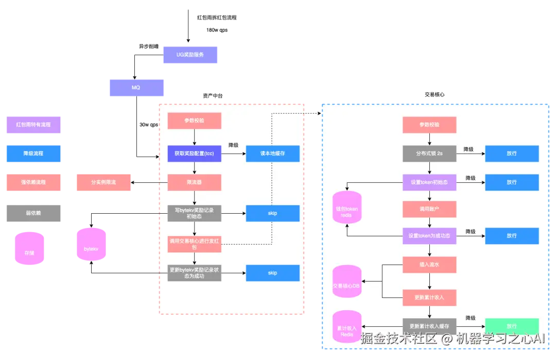 拆红包时,DB记录拆红包单据,然后执行资金转账。单据需要实时落地,而资金转账,这里做了多个层级的柔性降级方案: