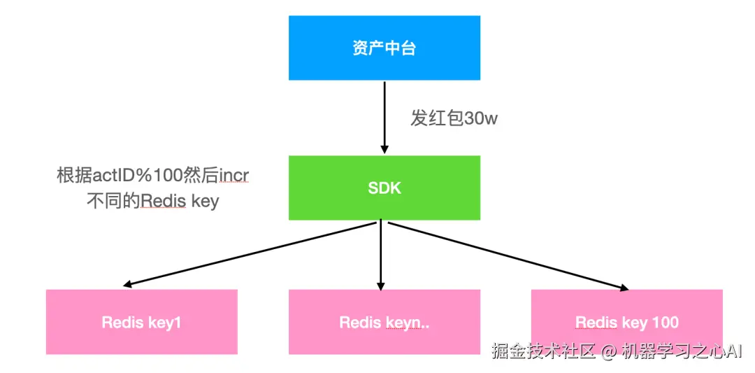 设计拆分 100 个 key,每次发红包根据请求的 actID%100 使用 incr 命令累加该数字,因为不能保证幂等性,所以超时不重试。