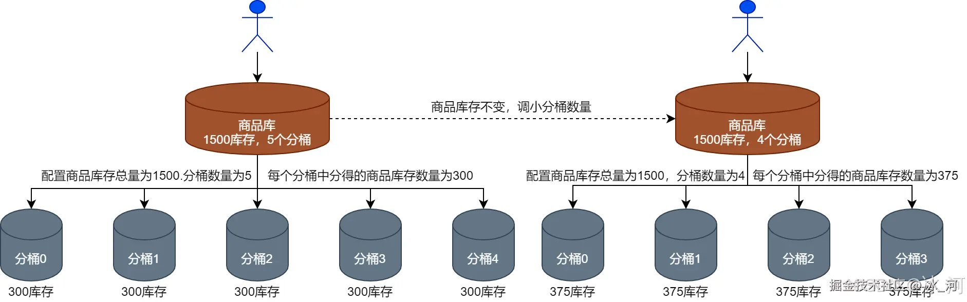 那有没有一些极端情况,某些分桶中的库存无法售罄呢?这种情况不能说没有,有可能会出现,但是概率极低。如果确实存在某些分桶中的库存无法售罄的情况,则可以通过人工干预的方式收缩库存分桶,将没有售罄的分桶库存收缩到一个分桶中,这样将相当于库存没有分桶了,后续所有的请求都会被路由到同一个库存分桶中,最终库存都会被售罄。